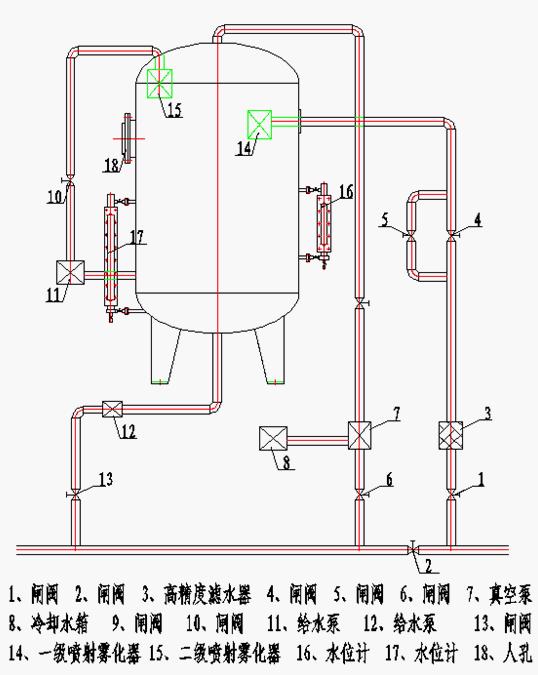 兩級噴射式真空除氧器設備組成: 兩級噴射式真空除氧器( 簡稱無頭除氧器)、由一級高噴射裝置、二級噴射裝置, 增壓泵組, 真空泵組,減溫水箱,流量計,汽動閥,高精度濾水器,多位閘閥,PLC全自動控制箱等組成。 兩級噴射真空除氧器內裝設有一級噴射裝置,使用時先啟動真空泵組,真空缸的壓力達到-0.09Mpa時,打開汽動閥門,給水泵將軟化水送入高精度濾水,再進入一級噴射器增壓,形成高效率霧化裙,在高真空下運行,除去給水中百分之九的氧。粗除氧水落入成積箱后,一級給水泵將粗除水送入二級噴射器內。經二級噴射器 增壓噴出,形成霧化裙,粗除氧的水在同等真空下,又將溫度提高一層,經二級除氧的水落在真空缸下部,當水位計克度達到400mm時,啟動鍋爐給水泵將二次除氧的水抽出經流量計送給鍋爐。 兩級噴射真空除氧器設計合理,運行穩(wěn)定,使用場合廣,適用性能強,結構緊湊,占地面積小,耗功極低,可利用PLC自動控制,工作噪聲低,沒有振動,安裝布置簡單。