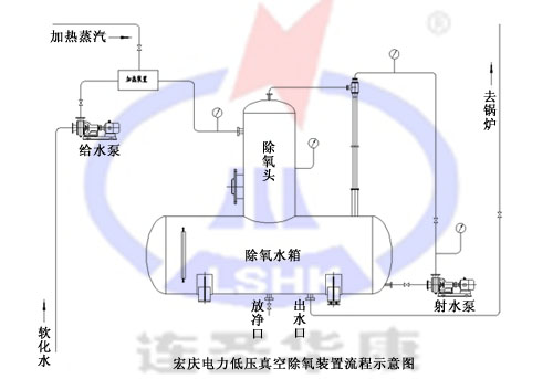 設(shè)備組成 旋膜真空除氧器主要是由除氧器(除氧頭及除氧水箱)、高效旋膜裝置、水噴射真空泵機組、引水泵機組等組成。 旋膜除氧器內(nèi)裝設(shè)有高效旋膜裝置,將自然降膜改為強力旋膜,增加液膜的旋轉(zhuǎn)速度,液體沿旋膜內(nèi)壁旋轉(zhuǎn)形成小膜裙,增強分散度、傳質(zhì)功能;并將保持汽(氣)體通道;將獨立的三種傳熱傳質(zhì)方式縮化為一體,主要突出以提高真空降低沸點的原理,在一個單元部件內(nèi)完成。由于它具有很高的除氧效率和以提高真空降低沸點的特殊功能,突破了低溫低壓除氧的技術(shù)性能。 旋膜除氧器運行時,除氧水箱處于負(fù)壓狀態(tài)。在高位安裝時,水箱出水口與鍋爐給水泵進(jìn)口的距離較大,最好不小于10米;低位安裝時,水箱出口于引水泵機組相連接,使負(fù)壓水升壓后進(jìn)入鍋爐給水泵。 水噴射真空泵機組中配用了長喉型射水抽氣器,這種抽氣器具有設(shè)計結(jié)構(gòu)緊湊,耗功低。并具有很高的抽吸效率,在同等條件下抽吸量超出老式的一倍。低噪聲運行,沒有振動,安裝布置更簡單。 引水泵機組的作用是在除氧器低位安裝時,通過引水泵將負(fù)壓水升壓后進(jìn)入鍋爐給水泵。