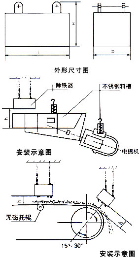 簡述: 懸掛式永磁除鐵器內(nèi)部采用高矯頑力,高剩磁的特殊永磁體“釹鐵硼”等材料組成復(fù)合磁系。具有免維護(hù)、磁力強(qiáng)、壽命長、安裝簡單、使用方便、運(yùn)行可靠等特點(diǎn),適用于皮帶機(jī)、振動輸送機(jī)、電磁振動給料機(jī)、下料溜槽上的非磁性物料中除鐵。清除0.1~35公斤的鐵磁性物質(zhì),內(nèi)部永磁磁系使用壽命10年以上。該產(chǎn)品各項(xiàng)技術(shù)指標(biāo)符合JB/T8711--1998標(biāo)準(zhǔn)。 當(dāng)永磁鐵吸附鐵磁物較多時(shí),人工用非磁性刮板清除或戴手套摘除,適用于連續(xù)工作,含鐵較少的場合。 適用范圍: 適合沒有輸送皮帶,物料中含鐵較少且只能提供下料溜槽的場合。主要應(yīng)用于水泥、化工、煤炭、塑料、耐火材料、建材等行業(yè)的下料管道中清除雜物。技術(shù)特點(diǎn):聚磁復(fù)合磁第,雙磁極結(jié)構(gòu),弱場強(qiáng)度高,吸力大。磁極吸附面積大,保障有足夠時(shí)間從運(yùn)行物料中吸起鐵雜物。管道為全密封結(jié)構(gòu),除鐵器外置安裝,避免長期連續(xù)使用使除鐵器磨損。體積小,重量輕,安裝方便,除鐵干凈,維護(hù)簡單。