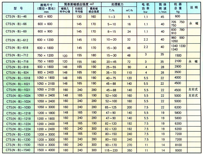 一、概述: 永磁筒式磁選機適用于礦山、選煤廠等單位,用于弱磁場濕式選別細(xì)顆粒的強磁性礦物,或者除去非磁性礦物中混雜的強磁性礦物。 該機有三種槽體:半逆流槽(CTB);順流槽(CTS)和逆流槽(CTN),分別適用于不同選別顆粒度及不同選別工藝的要求。 我公司產(chǎn)品的特點是:采用計算機優(yōu)化設(shè)計,磁路合理并嚴(yán)格選用高矯頑力,高剩磁的永磁體,確保磁性在長時間內(nèi)不降低,保障用戶的長遠利益,整體結(jié)構(gòu)可靠耐用,分別適用于不同選別顆粒度及不同選別工藝的要求。 該機是專門為重介質(zhì)選煤廠回收磁性介質(zhì)設(shè)計的全逆筒式磁選設(shè)備。該系列設(shè)備的磁場的分布特征有利于微細(xì)粉的最大回收效果,巧妙設(shè)計了分選設(shè)備中產(chǎn)生合理礦漿流向的相應(yīng)結(jié)構(gòu),使磁性礦物的回收率大大提高,該設(shè)備對物料流量、濃度等參數(shù)變化的適應(yīng)性強,廣泛用于重介質(zhì)選煤廠。 工作原理: 該類設(shè)備利用永磁磁系所產(chǎn)生的磁力,將礦漿中的磁性礦物吸引到圓筒表面上來,并隨著圓筒一起旋轉(zhuǎn),待脫離磁場作用后在重力、(刮板)作用下,排出機外,而非磁性物料從尾礦口排除,完成分選作用。