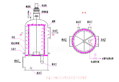 水從立式清洗全自動濾水器下部的進(jìn)水口進(jìn)入進(jìn)水室,進(jìn)水室上部有一塊進(jìn)水板,進(jìn)水板上開有一個弧形孔,水從弧形孔進(jìn)入圓柱形濾網(wǎng)的內(nèi)側(cè),在圓柱形濾網(wǎng)的表面開了若千小孔,水從濾網(wǎng)內(nèi)側(cè)流到濾網(wǎng)外側(cè),雜質(zhì)被擋在濾網(wǎng)內(nèi)側(cè),隨著運(yùn)行時間的延續(xù),濾網(wǎng)內(nèi)側(cè)壁上雜物越積越多。濾網(wǎng)內(nèi)側(cè)有4-8塊隔板,上圖為6塊隔板,它把濾網(wǎng)內(nèi)側(cè)分隔成6個獨(dú)立的扇形小室,其中s個扇形小室與進(jìn)水板的弧形進(jìn)水孔相通,起過濾作用,進(jìn)水板上除開設(shè)弧形孔外,還開設(shè)了一個排污孔,排污孔與通向循環(huán)水排水管的排污管相連,排污管上裝設(shè)一個電動排污閥,當(dāng)電動排污閥開啟時,在與排污孔相對應(yīng)的一個扇形小室中,水從濾網(wǎng)的外側(cè)流向濾網(wǎng)的內(nèi)側(cè),通過排污管流向循環(huán)水排水管。 通過控制箱面板上計時器的設(shè)置,濾網(wǎng)能定期順時針轉(zhuǎn)過60*,即一個獨(dú)立扇形小室與排污孔相通,濾網(wǎng)內(nèi)側(cè)的雜物由濾網(wǎng)外側(cè)的水沖入排污管,對這個扇形小室的濾網(wǎng)表面進(jìn)行清洗,清洗時間為2~8分鐘,然后再轉(zhuǎn)過60。重復(fù)以上過程,系統(tǒng)每小時(可調(diào))自動清洗一次濾網(wǎng)。 如果水質(zhì)不太臟,為了節(jié)約用水,可實(shí)現(xiàn)間斷清洗,正常運(yùn)行時可不打開電動排污閥,根據(jù)水質(zhì)情況定期啟閉排污閥。本設(shè)備的控制系統(tǒng)可整定電動排污閥每隔2-8小時開啟一次,每次開啟的時間為10-60分鐘,從而完成間斷清洗的功能。 當(dāng)垃圾較多時,可采用連續(xù)反沖洗,通過把控制器面板上反沖洗開關(guān)置于開啟位置來觸發(fā)。本設(shè)備的控制系統(tǒng)可根據(jù)水質(zhì)情況任意調(diào)節(jié)排污時間。 工作方式:自動和手動。 自動控制模式采用時間控制模式。系統(tǒng)每8小時(可調(diào))自動清洗一次濾網(wǎng)。需要時可采用手動控制模式。當(dāng)電動機(jī)失去電源或損壞時,拔去聯(lián)軸器中方鍵可手操轉(zhuǎn)盤,實(shí)行手動清洗。 三、立式清洗全自動濾水器主要結(jié)構(gòu): 本設(shè)備主要由筒體、濾網(wǎng)和傳動機(jī)構(gòu)三部分組成。 ㈠筒體由上下兩部分組成。下簡體為進(jìn)水室,下筒體上有排污口、放水口和進(jìn)水口,進(jìn)水板在進(jìn)水室上部,依靠主管支承在底板上。上簡體由圓筒和封頭組成,上筒體上有出水口,封頭上有一根放氣管,封頭上焊有座架,用于支承傳動裝置。上下簡體依靠法蘭連接。 ㈡濾網(wǎng)由軸、隔板和網(wǎng)板組成。軸的下端支承于軸座上,軸的上端與聯(lián)軸器相連。隔板和網(wǎng)板的材料均為1Cr18Ni9Ti,網(wǎng)板上的小孔直徑一般為中6mm,網(wǎng)板上的小孔均經(jīng)過擴(kuò)孔,表面光滑,易于清洗。 ㈢傳動機(jī)構(gòu)由電動機(jī)、行星擺線減速機(jī)和聯(lián)軸器組成。聯(lián)軸器中有根方鍵,當(dāng)電動機(jī)失去電源或損壞時,拔去方鍵可手操轉(zhuǎn)盤,實(shí)行手動清洗。在聯(lián)軸器下方安裝的轉(zhuǎn)盤上,有4-8塊撞塊,它與行程開關(guān)起控制濾網(wǎng)的轉(zhuǎn)和停。 四、立式清洗全自動濾水器技術(shù)規(guī)范: 額定流量:2000、2500、3000、4000、50300、400、600、800、1000、1500、OO、6000t/h 額定流量下的阻力:sE0.02MPa 工作壓力:0.25MPa 水壓試驗壓力:0.375Mpa 工作電壓:380V 減速機(jī)的出軸轉(zhuǎn)速:0.7-1.2r/min 排污水量不超過濾水總量的5% 五、立式清洗全自動濾水器運(yùn)行: ⑴運(yùn)行前應(yīng)檢查電動機(jī)、電動頭和控制箱的絕緣,合格后方可進(jìn)行下一步操作。 ⑵確認(rèn)濾網(wǎng)轉(zhuǎn)停時間和排污閥開關(guān)時間,如安裝后調(diào)試或大修后調(diào)試則應(yīng)調(diào)整時間繼電器,注意調(diào)整時間繼電器時必須切斷電源,不可帶電作業(yè)。 ⑶運(yùn)行前檢查減速機(jī)內(nèi)油質(zhì)、油量、合格后方可啟動。 ⑷運(yùn)行前檢查濾網(wǎng)轉(zhuǎn)動是否靈活,如發(fā)現(xiàn)卡澀或有異常聲響應(yīng)檢查原因,消缺后方可啟動。 ⑸檢查各閥門開關(guān)是否靈活。關(guān)閉出水閥、電動排污閥、放水閥,開啟進(jìn)水閥和放氣閥。當(dāng)放氣閥出口冒水后關(guān)閉放氣閥。 ⑹向濾網(wǎng)電動機(jī)送電,觀察濾網(wǎng)旋轉(zhuǎn)是否平穩(wěn),行程開關(guān)與轉(zhuǎn)盤上的撞塊位置是否吻合,濾網(wǎng)的轉(zhuǎn)停時間是否達(dá)到要求,如不符要求則應(yīng)停止運(yùn)行,并予消缺。 ⑺開啟出水閥,檢查濾網(wǎng)運(yùn)轉(zhuǎn)是否平穩(wěn),填料處有無漏水,如有漏水應(yīng)擰緊填料蓋螺母,做到濾網(wǎng)轉(zhuǎn)動正常,填料處不漏水。 ⑻檢查電動排污閥開閉時間是否符合要求。 ⑼啟動冷卻水升壓泵后,應(yīng)對立式清洗全自動濾水器再做一次全面檢查,如無異常情況,則立式清洗全自動濾水器進(jìn)入正常運(yùn)行狀態(tài)。 ⑽立式清洗全自動濾水器停役后,關(guān)閉進(jìn)出水閥和電動排污閥,開啟放水閥和放氣閥。放空存水,以免冬季結(jié)冰脹壞管子。如作為運(yùn)行備用,則可不必開啟放水閥和放氣閥。 六、立式清洗全自動濾水器安裝維護(hù)說明: ①凡