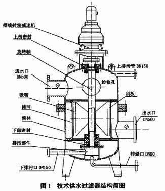 下面新型全自動濾水器由連云港市神美電力輔機(jī)有限公司生產(chǎn),通過龍灘水電站機(jī)組且技術(shù)供水系統(tǒng)過濾器存在其濾筒內(nèi)部刮板經(jīng)常失效,雜物大部分容易纏繞在旋轉(zhuǎn)臂上,而且纏的很緊,清污時根本反沖不掉,經(jīng)過多次的技術(shù)比較和認(rèn)證,連云港市神美電力公司新型全自動濾水器最顯著特點(diǎn)就是完全靠水力驅(qū)動,控制裝置簡單可靠,經(jīng)過長期時間的實際運(yùn)行,有效地解決了現(xiàn)場存在的問題,提高了設(shè)備的自動化水平。 龍灘水電站的機(jī)組技術(shù)供水過濾器采用國產(chǎn)設(shè)備,設(shè)計壓力2.5 MPa,過濾精度4 mm,設(shè)計流量2500 m3/h,該結(jié)構(gòu)采用不銹鋼板鉆孔濾網(wǎng),配合大吸嘴和刮板,以清除吸附在濾網(wǎng)內(nèi)壁的雜物,其結(jié)構(gòu)見圖1所示。圖1技術(shù)供水過濾器結(jié)構(gòu)簡圖過濾器工作時,壓力水(臟水)從過濾器上部流入濾筒內(nèi)部,經(jīng)Φ4網(wǎng)孔后,由于壓差的作用,雜物一部分留在濾桶內(nèi),另一部分掛在濾筒的內(nèi)壁上。這樣濾網(wǎng)的外部,就變成了相對清潔的壓力水,以保證過濾器后面管路中水質(zhì)的清潔。清潔的壓力水從過濾器的下部水平管路流出。 該過濾器有3種清污方式: (1)手動清污:隨時在現(xiàn)地,通過啟動按鈕將過濾器上部的電機(jī)手動開啟,則過濾器中旋轉(zhuǎn)軸帶動刮板旋轉(zhuǎn),將懸掛在濾筒內(nèi)壁的雜物刮掉,通過手動打開下部排污閥門及上部清漂管路的電動閥,將底部雜物和上部漂浮物排到集水井中,達(dá)到手動清污的作用。 (2)定時清污:按照事先確定的過濾器工作時間,一旦達(dá)到過濾器的運(yùn)行小時數(shù),則自動打開過濾器上部清漂管路電動閥及啟動電機(jī),將漂浮物排到集水井。 (3)差壓清污:當(dāng)過濾器內(nèi)部出現(xiàn)堵塞現(xiàn)象時,過濾器的進(jìn)口和出口的壓力差增大,達(dá)到過濾器外部的差壓開關(guān)的設(shè)定點(diǎn)時,開關(guān)接點(diǎn)閉合,則自動啟動電機(jī)和打開下部排污閥門及上部清漂管路的電動閥,將雜物排至集水井。 過濾器使用中存在的問題及原因機(jī)組技術(shù)供水過濾器于上游水質(zhì)較差,經(jīng)常出現(xiàn)以下問題,給水輪發(fā)電機(jī)組的安全運(yùn)行帶來很大的隱患。 (1)過濾器堵塞。電站初期運(yùn)行時,由于水頭較低,管路中的水質(zhì)很臟,雜物很多,存在大量的泥沙、石塊、漁網(wǎng)、樹枝、樹葉、死魚、塑料布等雜物。該雜物由于量大成分復(fù)雜,且粒度超過濾筒網(wǎng)眼的直徑而不能通過,留在濾筒內(nèi)部。如果不經(jīng)常對過濾器進(jìn)行清污,勢必導(dǎo)致雜物將過濾器濾筒網(wǎng)孔大部分堵死,最終失去過濾作用。 (2)刮板失效導(dǎo)致清污不徹底,清污能力差。過濾器濾筒的內(nèi)部有兩個旋轉(zhuǎn)臂,在一側(cè)的旋轉(zhuǎn)臂上,有一個非金屬材料制成的刮板,該刮板緊貼在過濾器濾筒的內(nèi)壁上,通過壓板和螺栓固定在旋轉(zhuǎn)臂上,清污時隨著電機(jī)的旋轉(zhuǎn)而繞旋轉(zhuǎn)軸旋轉(zhuǎn)。通過對過濾器分解檢查發(fā)現(xiàn),該刮板材質(zhì)太柔軟,沒有硬度,根本不能刮除吸附在濾筒上的雜物,同時隨著旋轉(zhuǎn)臂的旋轉(zhuǎn),雜物大多都夾雜在刮板和濾筒之間,更使得刮板的作用大大削弱,再者就是旋轉(zhuǎn)臂的面積太大,水中的雜物大部分容易纏繞在旋轉(zhuǎn)臂上,而且纏的很緊,清污時根本反沖不掉。隨著濾網(wǎng)堵塞的加劇,在不均勻壓力的作用下,濾筒發(fā)生嚴(yán)重變形,變成一個不規(guī)則的圓柱體,而刮板的旋轉(zhuǎn)半徑是固定的,因此不能滿足濾筒半徑變化的需要,經(jīng)常造成刮板折斷、丟失。 (3)吸嘴距離濾網(wǎng)內(nèi)壁較遠(yuǎn),清污效果不明顯。過濾器反沖洗時,由于吸嘴距離濾網(wǎng)內(nèi)壁較遠(yuǎn),加之吸嘴過大,對濾網(wǎng)上的雜物吸附作用大大降低,起不到應(yīng)有的作用,因此才導(dǎo)致清污效果不明顯的問題。 (4)減速器與旋轉(zhuǎn)軸的連接銷經(jīng)常折斷。為了保證過濾器上部電機(jī)的運(yùn)行安全,減速器與旋轉(zhuǎn)軸之間的連接銷采用了尼龍材料,以保證旋轉(zhuǎn)軸工作力矩過大時,連接銷首先剪斷,保護(hù)電機(jī)。由于過濾器堵塞嚴(yán)重,濾網(wǎng)變形,增加了旋轉(zhuǎn)軸的工作力矩,導(dǎo)致連接銷經(jīng)常剪斷,過濾器無法工作。 (5)排漂根本不起作用。設(shè)置在過濾器上部的排漂管路和閥門,原本是用來排除懸浮在過濾器濾筒內(nèi)部的漂浮物的,通過實際觀察,根本不起作用。原因是過濾器工作時,進(jìn)入濾筒上部的漂浮物由于濾網(wǎng)網(wǎng)孔前后壓差的作用,都吸附在濾網(wǎng)的內(nèi)壁上,貼得很緊,有的還夾在濾網(wǎng)的網(wǎng)孔里,當(dāng)過濾器工作在清污狀態(tài)時,即使是打開了清漂管路的閥門,也不能將吸附在濾筒內(nèi)壁上的雜物帶走。 (6)底部排污管路口徑太小,排污能力差,易堵塞。底部排污管的管徑原設(shè)計只有DN80,太小。底部沉積物堵塞嚴(yán)重時,根本排不出去。 (7)檢修孔太小,根本不能起到檢修的作用。過濾器上部的檢修孔徑小,只能觀察過濾器內(nèi)部的雜物和堵塞情況,檢修不方便。 (8)過濾器前后的壓力表經(jīng)常不正確。 新型自清洗過濾器的工作原理為了解決以上