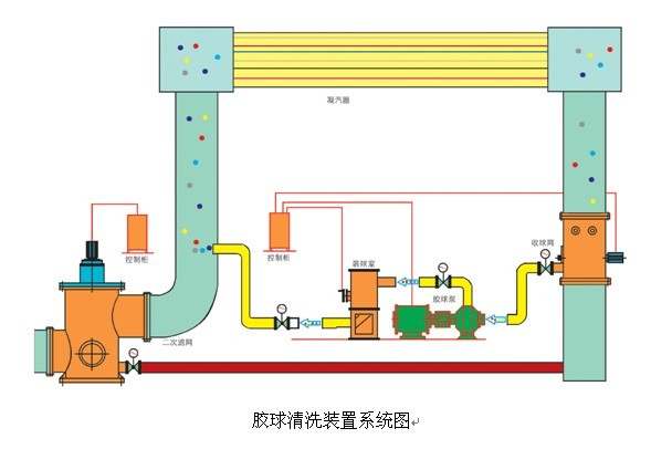 連云港神美電力輔機(jī)有限公司生產(chǎn)的凝汽器膠球清洗裝置,適用于50~600MW汽輪機(jī)發(fā)電機(jī)組,膠球清洗裝置主要由膠球泵、收球網(wǎng)、裝球室、電控柜以及附屬件等設(shè)備組成。 其工作原理是:膠球泵啟動(dòng),借助水流的作用將直徑大于冷凝管內(nèi)徑的海綿膠球擠進(jìn)凝汽器冷凝管,經(jīng)收球網(wǎng)收球再進(jìn)入裝球室。通過這一過程,膠球?qū)淠苓M(jìn)行清洗,維持冷凝管內(nèi)壁清潔,保證凝汽器設(shè)計(jì)換熱效率不下降,從而維持凝汽器的端差和汽輪機(jī)背壓;同時(shí)避免冷凝管內(nèi)壁腐蝕,改善運(yùn)行條件,延長機(jī)組壽命。 下面是膠球清洗裝置系統(tǒng)圖: