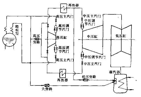 圖6-4中間再熱機(jī)組的旁路系統(tǒng)及主汽門、調(diào)節(jié)汽門布置 |